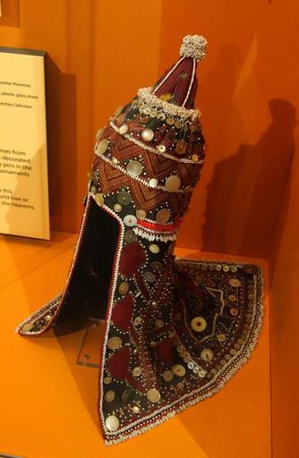 | Keywords: Headdress, Kohistan, Northwest Frontier Province, Pakistan, early 20th century, cotton, silk, silver, shell, plastic, glass, brass - Fernbank Museum of Natural History - DSC00080.JPG en Exhibit in the Fernbank Museum of Natural History Atlanta Georgia USA Photography was permitted in the museum without restriction 2012-03-17 00 51 49 own Daderot cc-zero Ethnographic items in the Fernbank Museum of Natural History Uploaded with UploadWizard Kohistan District | ||||