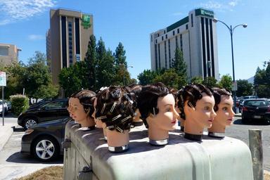 Keywords: heads hair hairdo hairstyle mannequins bizarre odd strange creepy collection public display group faces alike outdoors perspective dolls