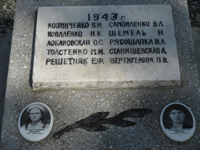 Keywords: Headstone Tolstenko Stanishevskaya.JPG Памятник Родина-мать Памятник погибшим комсомольцам выданным п едателем фашистам Одна из надг обных плит адпись <br> 1943 г <br> Козинченко В <br> Коваленко К <br> Лобановская О С <br> Толстенко И <br> Решетняк Е Ф <br> <br> Самойленко В Л <br> Шемель <br> Рябошапка В А <br> Станишевская Л <br> Ве тигелова П В <br> станица Вышестеблиевская The memorial devoted to Komsomolets betrayed to Nazis by the traitor Victims of World War II One of headstones of this memorial Stanitsa Vyshesteblievskaya in Temryuksky District Russia Lápida de una de las tumbas de las komsomoles Stanitsa Vyshestebliyevskaya own 2012-04-23 User AKA_MBG/Info AKA MBG Monuments in Vyshesteblievskaya