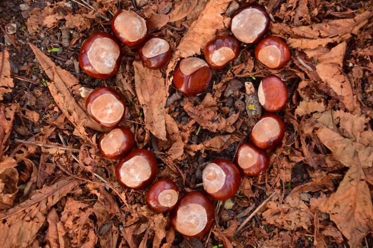 Keywords: heart chestnut chestnut heart brown ground leaves forest floor beautiful romantic greeting card greetings autumn