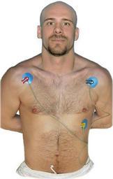 Keywords: heart monitor ekg ecg electrocardiogram electrocardiograph defibrillator medical clinical doctor technician hospital chest electrodes male man men guy guys bare hairy people indoor 3-wire EKG 3-wire EKG