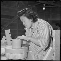 | Keywords: Heart Mountain Relocation Center, Heart Mountain, Wyoming. Minnie Negoro, an art student at the Uni . . . - NARA - 539263.jpg Scope and content The full caption for this photograph reads Heart Mountain Relocation Center Heart Mountain Wyoming Minnie Negoro an art student at the University of California in Los Angeles before the evacuation of persons of Japanese ancestry from west coast defense areas is taking up the art of the potters wheel at the Heart Mountain Relocation Center Ceramics Plant where dishes and other pottery products for this and every other relocation center will be made General notes 539263 Local identifier 210-G-E708 Department of the Interior War Relocation Authority 02/16/1944 - 06/30/1946 NARA-Author Parker Tom Photographer 4682167 <br /> Still Picture Records Section Special Media Archives Services Division NWCS-S National Archives at College Park 8601 Adelphi Road College Park MD 20740-6001 1943-01-12 Record group Record Group 210 Records of the War Relocation Authority 1941 - 1989 Record group ARC 537 Central Photographic File of the War Relocation Authority compiled 1942 - 1945 Series ARC 536000 File unit File unit ARC Variant control numbers NAIL Control Number NWDNS-210-G-E708 Other versions <gallery> File Heart_Mountain_Relocation_Center _Heart_Mountain _Wyoming _Minnie_Negoro _an_art_student_at_the_Uni_ _ _ _-_NARA_-_539263 tif tif File Heart_Mountain_Relocation_Center _Heart_Mountain _Wyoming _Minnie_Negoro _an_art_student_at_the_Uni_ _ _ _-_NARA_-_539263 jpg jpg </gallery> NARA-cooperation PD-USGov Heart Mountain War Relocation Center |