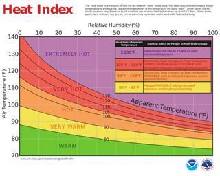 | Keywords: Heat Index.svg en The ˜Heat Index ™ is a measure of how the hot weather feels to the body This table uses relative humidity and air temperature to produce the apparent temperature or the temperature the body feels These values are for shady locations only Exposure to full sunshine can increase heat index values by up to 15°F Also strong winds particularly with very hot dry air can be extremely hazardous as the wind adds heat to the body 2012-03-24 http //www srh noaa gov/jetstream/global/hi htm http //www srh weather gov/jetstream/downloads/heatindex_graph_20x16 pdf National Weather Service Southern Region Headquarters PD-USGov Uploaded with UploadWizard Heat and humidex Indices |