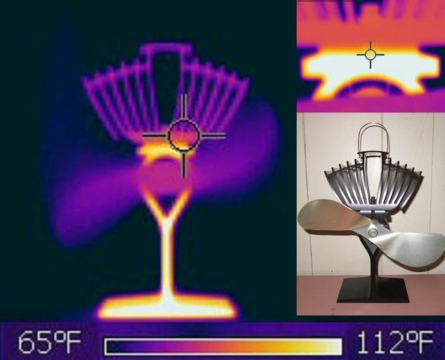 | Keywords: Heat powered fan thermal image.jpg en Thermal image of a heat-powered fan used to circulate the heat from a wood stove The camera's sight is focused on the semi-conductor which produces electricity to power the fan's motor The upper inset shows a close-up of the semi-conductor This area is the transitional zone where thermal energy is first turned into positive work electric current generation and then into negative work or entropy heating of the cooling fins The heat is then dispersed into the air where it rejoins the heat from the wood stove to heat the house returning it to a useful form of work or negative entropy The lower inset shows the fan in visible light 2011-07-20 own Zaereth cc-zero Uploaded with UploadWizard Thermal images Fans with two blades |