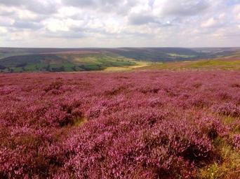 Keywords: heather farndale yorkshire moorland fields field of flowers panorama view