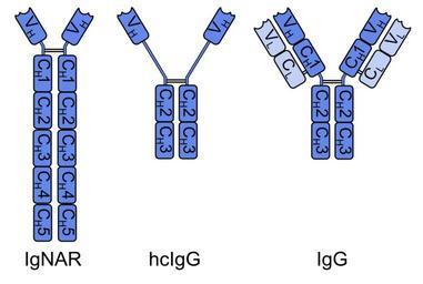 | Keywords: Heavy chain and common antibody.svg heavy chain antibodies in comparison to an ordinary antibody IgNAR shark heavy chain antibody hcIgG camelid heavy chain antibody IgG ordinary antibody V<sub>H</sub> heavy chain variable antigen-binding domain C<sub>H</sub>1 “C<sub>H</sub>5 heavy chain constant domains V<sub>L</sub> light chain variable domain C<sub>L</sub> light chain constant domain Heavy chains are shown in a darker shade light chains in a lighter shade own Anypodetos 2010-01-20 Based on File Antibody je2 neutral svg Created with Inkscape Antibodies |
