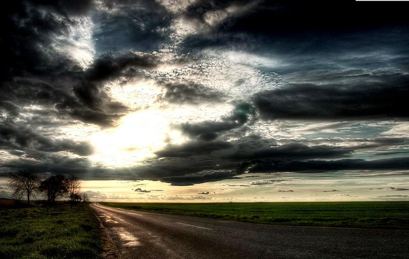 Keywords: heavy weather heavy sky thunderstorm road sunset bad weather