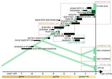 Keywords: Hebrew Human Evolution 03.svg en A timeline of hominids fossils in Hebrew own H sapiens 2009-10-30 Phylogenetic trees of humans Diagrams in Hebrew