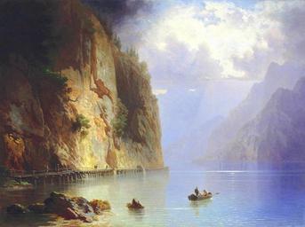 | Keywords: Heinrich Heinlein - Bergsee mit steiler Felswand.jpg Heinrich Heinlein 1803 “ 1885 title Bergsee mit steiler Felswand 1860/70 oil on canvas cm 53 72 5 Museum Georg Schäfer MGS 899 Heinr Heinlein ~ lower left signature http //www faz net/aktuell/feuilleton/kunst/bildergalerie-kuenstler-sehen-bayern-in-schweinfurt-sujet-schreit-s-von-der-hoeh-12279791 html faz net Other versions PD-old-100 Heinrich Heinlein Sammlung Georg Schäfer 1860s landscape paintings Paintings of boats | ||||
