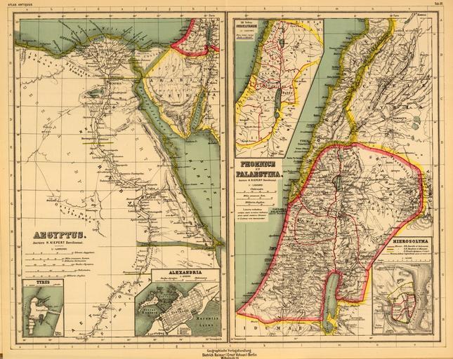 | Keywords: Heinrich Kiepert. Aegyptus. Phoenice et Palaestina.jpg en Aegyptus Phoenice et Palaestina with Tyrus with Alexandria with XII tribus Israelitarum with Hierosolyma Auctore H Kiepert Berolinensi Geographische Verlagshandlung Dietrich Reimer Ernst Vohsen Berlin Wilhemlstr 29 1903 http //www davidrumsey com/luna/servlet/detail/RUMSEY~8~1~34459~1180071 Aegyptus--Phoenice-et-Palaestina--- sort Pub_List_No_InitialSort 2CPub_Date qvq q 2BPub_List_No 3D 270405 000 2B 27 22 2B;sort Pub_List_No_InitialSort 2CPub_Date;lc RUMSEY~8~1 mi 4 trs 14 www davidrumsey com Creator Heinrich Kiepert 1903 PD-old-100 Atlas antiquus by Heinrich Kiepert David Rumsey Historical Map Collection Old maps of Egypt Old maps of Palestine Old maps of Jerusalem Old maps of the Middle East Old maps of Israel Maps of Phoenicia Egyptian Halayeb Triangle in 1903 Arabia Petra Egypt |