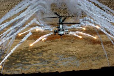 | Keywords: Helicopter and flares.jpg 070313-M-3968C-012 RIDGECREST California March 13 2007 - A CH-46 Sea Knight assigned to Marine Helicopter Squadron One Presidential Helicopter Squadron deploys its MJU-32/B round flares over Naval Air Weapons Station China Lake The squadron was participating in a testing event for a new deployment tactic for the 36mm MJU-32/B round flare U S Marine Corps photo by Lance Corporal Kelly R Chase RELEASED Hubschrauber wirft Flare ab http //www navy mil/view_image asp id 44250 2007-03-17 Kelly R Chase PD-USGov-Military-Navy CH-46 Sea Knight Decoy flares Naval Air Weapons Station China Lake |