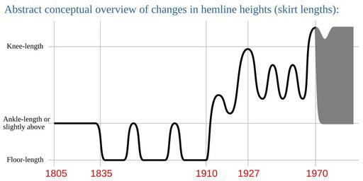 | Keywords: Hemline (skirt height) overview chart 1805-2005.svg An abstract conceptual overview graph of changes in hemline heights skirt lengths in middle- and upper-class western women's clothes over two hundred years 1805-2005 The curve in this image is not based on exact numerical data but instead presents a summary of broad general trends i e the graph is more qualitative than quantitative or not to precise scale Before World War I the hemlines of middle- and upper-class adult women's ordinary public clothes in western societies had varied only between floor length and an inch or two above ankle length at most for centuries This graph shows how things then changed in a previously-unprecedented way On the left hemline height is indicated as being at ankle length or slightly above at the chronological start date of 1805 i e 200 years before the date the first version of this chart was made then dropping to floor-length ca 1835 where it stayed for most of the remainder of the 19th century with a few temporary excursions back to ankle-length -- see File 1794-1887-Fashion-overview-Alfred-Roller GIF During WW1 hemlines rose far above ankle-length relatively quickly -- and then in the mid 1920's after a brief dip rose almost all the way to knee length During the period from the early 1930's to the mid 1960's hemlines fluctuated in a zone which was quite different from the zone where hemlines had fluctuated during the 19th century In the late 1960's hemlines rose significantly above knee length for the first time In the early 1970's some women stayed with the miniskirt some women went to the other extreme of ankle-length granny dresses while fashion designers tried to push an intermediate midi skirt length see illustrations from September 1971 issue of Women's Wear Daily on p 473 of Survey of Historic Costume ISBN 1-56367-142-5 The strong rejection by women of the attempt to impose the midi as the new norm marked the end of only one skirt-length at a time -- while fashion trends continued to come and go from the 1970's on it was no longer true that a woman had to wear one particular socially-predominating skirt-length or be considered almost hopelessly unstylish Instead a variety of skirt-lengths now became acceptable though after the early 1970's the miniskirt itself didn't return as a mainstream fashion until the mid-1980's -- and of course in many contexts women are free to wear trousers instead of a skirt or dress This era of relative fashion freedom is shown as the dispersed grey area on the right of the chart The curve and gray area shown in the graph are loosely based on information from a number of sources and historical illustrations The graph itself was made from scratch by H Churchyard in April 2005 and modified for Wikipedia and uploaded to Wikimedia Commons in June 2008 Graphic made by H Churchyard in April 2005 modified for Wikipedia and uploaded to Wikimedia Commons June 2008 Graphic made by H Churchyard in April 2005 modified for Wikipedia and uploaded to Wikimedia Commons June 2008 For the skirt lengths of little girls' clothes which before the 1930s were often much shorter than the skirt lengths of adult women's clothes see Image 1868-skirt-lengths-girl-ages-Harpers-Bazar gif 19th-century fashion 20th-century fashion Dress diagrams Line charts SVG clothing |