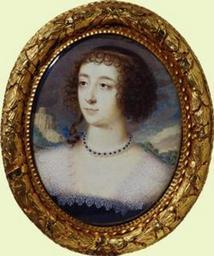 | Keywords: people picture frame Henrietta Maria of France, Queen consort of England, Scotland and Ireland (25 November[1] 1609 – 10 September 1669) was the consort of Charles I. She was the mother of two kings, Charles II and James II, and was grandmother to Mary II, William III, and Anne of Great Britain. Henriette-Marie de France was born the daughter of the King of France and Navarre, Henry IV; her mother was the Italian Marie de Medici and was the second consort of Henry IV. As the daughter of the king, she was a Fille de France. She was the youngest sister of the future King Louis XIII of France. Her father was killed before she was under a year old in Paris on 14 May 1610; her mother was banished from the royal court in 1617. From birth she was a member of the House of Bourbon, Maison de Bourbon in French. She was born at the Palais du Louvre on 25 November 1609, but some historians give her a birthdate of 26 November. In England, where the Julian calendar was still in use, her date of birth is often recorded as 16 November. Henrietta Maria was brought up as a Roman Catholic. After her older sister Christine Marie of France married the Sovereign Duke of Savoy in 1619, Henriette Marie took on the highly prestigious style of Madame Royale; this style was used by the most senior royal princess at the French court. She first met her future husband while he was travelling to Spain to arrange a marriage with the Infanta Maria Anna of Spain; Charles met Henriette Marie in Paris en route. The trip however ended badly as the Spanish King Philip III demanded that Charles convert to Roman Catholicism and remain in Spain for a year after the wedding as a sort of hostage to ensure England's compliance with all the terms of the treaty. Charles was outraged, and upon their return in October, he and Buckingham demanded that King James declare war on Spain. Charles then looked elsewhere for a bride. He looked to France where the attractive Henriette Marie lived at the court of her brother and was still unmarried by 1625. This made her an unpopular choice of wife for the English King Charles I of England, whom she married by proxy on 11 May 1625, shortly after his accession to the throne. They were married in person at St. Augustine's Church, Canterbury, Kent, on 13 June 1625. However, her religion made it impossible for her to be crowned with her husband in an Anglican service. Initially their relationship was rather frigid. Henrietta Maria had brought a large and expensive retinue with her from France, all of them Roman Catholic. It is said that eventually Charles sent them home to France, only allowing his teenage bride to retain her chaplain and confessor, Robert Phillip, and two ladies in waiting. Finding her sadly watching the retinue depart for France at the window of a palace, Charles angrily and forcibly dragged his wayward queen away.[citation needed] Charles had intended to marry Maria Anna, a daughter of Philip III of Spain, but a mission to Spain in 1623 had failed. Perhaps this earlier disappointment explains why relations with his French bride were strained; every time the couple met, they started arguing and would separate, not seeing each other for weeks. When next they met, again they had to separate, because they could not stop arguing. Henrietta Maria took an immediate dislike to George Villiers, 1st Duke of Buckingham, the King's favourite. However, after Buckingham's death in August 1628, her relationship with her husband, Charles I, improved and they finally forged deep bonds of love and affection. Her refusal to give up her Catholic faith alienated her from many of the people and certain powerful courtiers such as William Laud, Archbishop of Canterbury and Thomas Wentworth, Earl of Strafford. Charles, on the other hand, had definite leanings towards Catholicism, and, once he had reached maturity, did not share his father's sexual ambivalence. Henrietta Maria increasingly took part in national affairs as the country moved towards open conflict through the 1630s. She despised Puritan courtiers to deflect a diplomatic approach to Spain and sought a coup to pre-empt the Parliamentarians. As war approached she was active in seeking funds and support for her husband, but her concentration on Catholic sources like Pope Urban VIII and the French angered many in England and hindered Charles' efforts. She was also sympathetic to her fellow Catholics and even gave a requiem in her private chapel at Somerset House for Father Richard Blount, S.J. upon his death in 1638. In August 1642, when the conflict began, she was in Europe. She continued to raise money for the Royalist cause, and did not return to England until early 1643. She landed at Bridlington in Yorkshire with troops and arms, and joined the Royalist forces in northern England, making her headquarters at York. She remained with the army in the north for some months before rejoining the King at Oxford. The collapse of the king's position following Scottish intervention on the side of Parliament, and his refusal to accept stringent terms for a settlement led her to flee to France with her sons in July 1644. Charles was executed in 1649, leaving her almost destitute. She settled in Paris, appointing as her chancellor the eccentric Sir Kenelm Digby. She angered both Royalists in exile and her eldest son by attempting to convert her youngest son, Henry, to Catholicism. She returned to England following the Restoration in October 1660 and lived as 'Dowager Queen' and 'Queen Mother' at Somerset House in London until 1665 when she returned permanently to France. After her son's restoration she returned to England where Pepys, on 22 November 1660, met her and described her as a 'very little plain old woman, and nothing more in her presence in any respect nor garb than any ordinary woman'. Her financial problems were resolved by a generous pension. She founded a convent at Chaillot, where she settled. In 1661 she saw her youngest daug