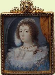 | Keywords: people picture frame Henrietta Maria of France, Queen consort of England, Scotland and Ireland (25 November[1] 1609 – 10 September 1669) was the consort of Charles I. She was the mother of two kings, Charles II and James II, and was grandmother to Mary II, William III, and Anne of Great Britain. Henriette-Marie de France was born the daughter of the King of France and Navarre, Henry IV; her mother was the Italian Marie de Medici and was the second consort of Henry IV. As the daughter of the king, she was a Fille de France. She was the youngest sister of the future King Louis XIII of France. Her father was killed before she was under a year old in Paris on 14 May 1610; her mother was banished from the royal court in 1617. From birth she was a member of the House of Bourbon, Maison de Bourbon in French. She was born at the Palais du Louvre on 25 November 1609, but some historians give her a birthdate of 26 November. In England, where the Julian calendar was still in use, her date of birth is often recorded as 16 November. Henrietta Maria was brought up as a Roman Catholic. After her older sister Christine Marie of France married the Sovereign Duke of Savoy in 1619, Henriette Marie took on the highly prestigious style of Madame Royale; this style was used by the most senior royal princess at the French court. She first met her future husband while he was travelling to Spain to arrange a marriage with the Infanta Maria Anna of Spain; Charles met Henriette Marie in Paris en route. The trip however ended badly as the Spanish King Philip III demanded that Charles convert to Roman Catholicism and remain in Spain for a year after the wedding as a sort of hostage to ensure England's compliance with all the terms of the treaty. Charles was outraged, and upon their return in October, he and Buckingham demanded that King James declare war on Spain. Charles then looked elsewhere for a bride. He looked to France where the attractive Henriette Marie lived at the court of her brother and was still unmarried by 1625. This made her an unpopular choice of wife for the English King Charles I of England, whom she married by proxy on 11 May 1625, shortly after his accession to the throne. They were married in person at St. Augustine's Church, Canterbury, Kent, on 13 June 1625. However, her religion made it impossible for her to be crowned with her husband in an Anglican service. Initially their relationship was rather frigid. Henrietta Maria had brought a large and expensive retinue with her from France, all of them Roman Catholic. It is said that eventually Charles sent them home to France, only allowing his teenage bride to retain her chaplain and confessor, Robert Phillip, and two ladies in waiting. Finding her sadly watching the retinue depart for France at the window of a palace, Charles angrily and forcibly dragged his wayward queen away.[citation needed] Charles had intended to marry Maria Anna, a daughter of Philip III of Spain, but a mission to Spain in 1623 had failed. Perhaps this earlier disappointment explains why relations with his French bride were strained; every time the couple met, they started arguing and would separate, not seeing each other for weeks. When next they met, again they had to separate, because they could not stop arguing. Henrietta Maria took an immediate dislike to George Villiers, 1st Duke of Buckingham, the King's favourite. However, after Buckingham's death in August 1628, her relationship with her husband, Charles I, improved and they finally forged deep bonds of love and affection. Her refusal to give up her Catholic faith alienated her from many of the people and certain powerful courtiers such as William Laud, Archbishop of Canterbury and Thomas Wentworth, Earl of Strafford. Charles, on the other hand, had definite leanings towards Catholicism, and, once he had reached maturity, did not share his father's sexual ambivalence. Henrietta Maria increasingly took part in national affairs as the country moved towards open conflict through the 1630s. She despised Puritan courtiers to deflect a diplomatic approach to Spain and sought a coup to pre-empt the Parliamentarians. As war approached she was active in seeking funds and support for her husband, but her concentration on Catholic sources like Pope Urban VIII and the French angered many in England and hindered Charles' efforts. She was also sympathetic to her fellow Catholics and even gave a requiem in her private chapel at Somerset House for Father Richard Blount, S.J. upon his death in 1638. In August 1642, when the conflict began, she was in Europe. She continued to raise money for the Royalist cause, and did not return to England until early 1643. She landed at Bridlington in Yorkshire with troops and arms, and joined the Royalist forces in northern England, making her headquarters at York. She remained with the army in the north for some months before rejoining the King at Oxford. The collapse of the king's position following Scottish intervention on the side of Parliament, and his refusal to accept stringent terms for a settlement led her to flee to France with her sons in July 1644. Charles was executed in 1649, leaving her almost destitute. She settled in Paris, appointing as her chancellor the eccentric Sir Kenelm Digby. She angered both Royalists in exile and her eldest son by attempting to convert her youngest son, Henry, to Catholicism. She returned to England following the Restoration in October 1660 and lived as 'Dowager Queen' and 'Queen Mother' at Somerset House in London until 1665 when she returned permanently to France. After her son's restoration she returned to England where Pepys, on 22 November 1660, met her and described her as a 'very little plain old woman, and nothing more in her presence in any respect nor garb than any ordinary woman'. Her financial problems were resolved by a generous pension. She founded a convent at Chaillot, where she settled. In 1661 she saw her youngest daug