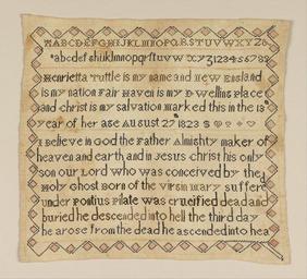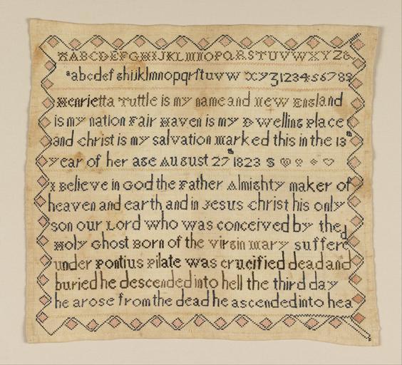 | Keywords: Henrietta Tuttle - Sampler - Google Art Project.jpg 1810 1830 Henrietta 6814939 Tuttle 1810 - 1830 /collection/cooper-hewitt-national-design-museum/artwork/sampler-henrietta-tuttle/6851317/ 176734 Henrietta Tuttle /artist/henrietta-tuttle/29088200/ 29088200 /collection/cooper-hewitt-national-design-museum/ Cooper-Hewitt National Design Museum 3644669 http //www cooperhewitt org/ /collection/cooper-hewitt-national-design-museum/artwork/sampler-henrietta-tuttle/6851317/ 1823 1823 Medium silk embroidery on linen foundationTechnique embroidered in cross stitch on plain weave foundation By 1981 Gertrude M Oppenheimer1981 Cooper-Hewitt Museum 380 6851317 False 1823 1981-28-150 http //collection cooperhewitt org/view/objects/asitem/id/176734 Bequest of Gertrude M Oppenheimer Sampler 1820 1830 w405 x h380 cm 1823 False 1 1010752688172 Object sampler-henrietta-tuttle Sampler s 405 H x W 38 1 x 40 6 cm 15 x 16 in Henrietta Tuttle is my name New England is my nationFair Haven is my dwelling place and Christ is my salvationMarked this in the 13th year of her age August 27th 1823 Medium silk embroidery on linen foundationTechnique embroidered in cross stitch on plain weave foundation By 1981 Gertrude M Oppenheimer1981 Cooper-Hewitt Museum special url_id RAEAbRLt_aQYNQ PD-old-100-1923 1830 Google Art Project works by Henrietta Tuttle Textiles in the Cooper “Hewitt Smithsonian Design Museum 1820s samplers Google Art Project works in Cooper-Hewitt Smithsonian Design Museum 1823 works |