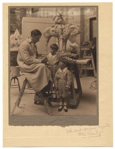 | Keywords: smithsonian institution smithsonianinstitution old photo oldphoto boys boy sculptor horse statue horsestatue sculpture shrady artesano escultura familt father sons studio people man artist sculptor's subjects sculptorssubjects henry merwin shrady henrymerwinshrady memorial to alpheus s. williams memorialtoalpheusswilliams master sculptor mastersculptor archives of american art archivesofamericanart Description: Shrady in his studio with his two sons Frederick and Lewis. In the background is the model of the sculptural work in progress, the memorial to General Alpheus Williams. Photo is signed by the photographer and annotated by Shrady to an unknown person, "With many sincere regards, H.M. Shrady." Shrady, Henry Mervin, 1871-1922 -- Photographs Creator/Photographer: Ira L. (Ira Lawrence) Hill Medium: Black and white photographic print Dimensions: 33 cm x 25 cm Date: c. 1911 Persistent URL: www.aaa.si.edu/collections/images/detail/henry-m-shrady-a... Repository: Archives of American Art Accession number: aaa_miscphot_5770 Description: Shrady in his studio with his two sons Frederick and Lewis. In the background is the model of the sculptural work in progress, the memorial to General Alpheus Williams. Photo is signed by the photographer and annotated by Shrady to an unknown person, "With many sincere regards, H.M. Shrady." Shrady, Henry Mervin, 1871-1922 -- Photographs Creator/Photographer: Ira L. (Ira Lawrence) Hill Medium: Black and white photographic print Dimensions: 33 cm x 25 cm Date: c. 1911 Persistent URL: www.aaa.si.edu/collections/images/detail/henry-m-shrady-a... Repository: Archives of American Art Accession number: aaa_miscphot_5770 |