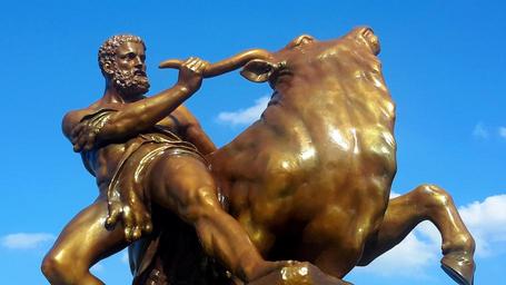 Keywords: heracles hercules sculpture bull artwork fig metal bronze