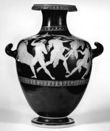 | Keywords: Herakles Painter - Red-Figure "Kerch-Style" Hydria - Walters 48263 - Side A.jpg The amorous interactions of humans and immortals achieve a light-hearted almost dance-like quality on this hydria or water-jug Hermes in the center pursues a youth towards the right with Eros floating above them On the left a satyr advances from below towards a maiden who attempts to flee ca 360 BC Classical terracotta cm 31 3 19 9 h x diam ; at handles cm 25 1 w accession number 48 263 31250 Arthur Sambon Paris 1920 mode of acquisition unknown no 20 Henry Walters Baltimore 1926 mode of acquisition unknown Walters Art Museum Henry Walters Acquired by Henry Walters 1926 Things With Wings Mythological Figures in Ancient Greek Art The Walters Art Museum Baltimore 2005-2006 Things With Wings Mythological Figures in Ancient Greek Art Ward Museum Salisbury 2009 place of origin Athens Greece Walters Art Museum license Ancient Greek red-figure pottery in the Walters Art Museum Herakles Painter Media contributed by the Walters Art Museum needs category review Satyrs in ancient Greek pottery Eros in ancient Greek pottery Pederasty in ancient Greek pottery |