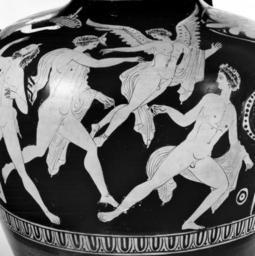 | Keywords: Herakles Painter - Red-Figure "Kerch-Style" Hydria - Walters 48263 - Side A Detail B.jpg The amorous interactions of humans and immortals achieve a light-hearted almost dance-like quality on this hydria or water-jug Hermes in the center pursues a youth towards the right with Eros floating above them On the left a satyr advances from below towards a maiden who attempts to flee ca 360 BC Classical terracotta cm 31 3 19 9 h x diam ; at handles cm 25 1 w accession number 48 263 31250 Arthur Sambon Paris 1920 mode of acquisition unknown no 20 Henry Walters Baltimore 1926 mode of acquisition unknown Walters Art Museum Henry Walters Acquired by Henry Walters 1926 Things With Wings Mythological Figures in Ancient Greek Art The Walters Art Museum Baltimore 2005-2006 Things With Wings Mythological Figures in Ancient Greek Art Ward Museum Salisbury 2009 place of origin Athens Greece Walters Art Museum license Ancient Greek red-figure pottery in the Walters Art Museum Herakles Painter Media contributed by the Walters Art Museum needs category review Pederasty in ancient Greek pottery Eros in ancient Greek pottery |