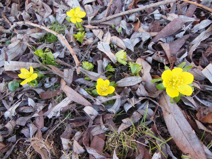 Keywords: herald of spring flowers eranthis yellow green background nature dead leaves brown
