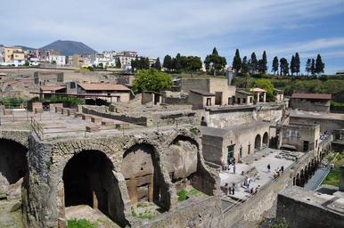| Keywords: architecture ruins outdoor arch rampart "Located in the shadow of Mount Vesuvius, Herculaneum (Italian: Ercolano) was an ancient Roman town destroyed by volcanic pyroclastic flows in 79 AD. Its ruins are located in the commune of Ercolano, Campania, Italy. It is most famous for having been lost, along with Pompeii, Stabiae, Oplontis and the neighborhood of Monte Bursaccio in Boscoreale, in the eruption of Mount Vesuvius in AD 79 that buried it in superheated pyroclastic material. It is also famous as one of the few ancient cities that can now be seen in almost its original splendor; unlike Pompeii, it was mainly affected by pyroclastic flows, thus preserving the wooden objects such as roof tops, building beams, beds, doors, and even food. Moreover, Herculaneum was a wealthier town than Pompeii, possessing an extraordinary density of fine houses, and far more lavish use of colored marble cladding. The discovery in recent years of some 300 skeletons along the sea shore came as a surprise, as it had been assumed that the town had been evacuated." ~Wikipedia "Located in the shadow of Mount Vesuvius, Herculaneum (Italian: Ercolano) was an ancient Roman town destroyed by volcanic pyroclastic flows in 79 AD. Its ruins are located in the commune of Ercolano, Campania, Italy. It is most famous for having been lost, along with Pompeii, Stabiae, Oplontis and the neighborhood of Monte Bursaccio in Boscoreale, in the eruption of Mount Vesuvius in AD 79 that buried it in superheated pyroclastic material. It is also famous as one of the few ancient cities that can now be seen in almost its original splendor; unlike Pompeii, it was mainly affected by pyroclastic flows, thus preserving the wooden objects such as roof tops, building beams, beds, doors, and even food. Moreover, Herculaneum was a wealthier town than Pompeii, possessing an extraordinary density of fine houses, and far more lavish use of colored marble cladding. The discovery in recent years of some 300 skeletons along the sea shore came as a surprise, as it had been assumed that the town had been evacuated." ~Wikipedia |