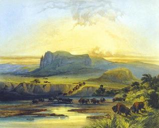| Keywords: Herd of Bisons on the upper Missouri. Tableau 40 after Karl Bodmer.jpg en Herd of Bisons on the upper Missouri Tableau 40 by J Bishop and Sigismond Himely after Karl Bodmer de Bisonherde am oberen Missouri Tableau 40 Aquatint etching and roulette; hand-colored on paper Herd of Bisons on the upper Missouri First State by J Bishop and Sigismond Himely after Karl Bodmer Tableau 40 in Maximilian zu Wied-Neuwied Maximilian Prince of Wied ™s Travels in the Interior of North America during the years 1832 “ 1834 Achermann Comp London 1843-1844 See Image Landscape with Herd of Buffalo on the Upper Missouri Watercolor by Karl Bodmer 1833 jpg created about 1837 J Bishop and Sigismond Himely after Karl Bodmer Reproduction of an aquatint etching and roulette; hand-colored that is in the public domain because of its age PD-art History of the United States Engravings of animals Bisons in art Sigismond Himely |
