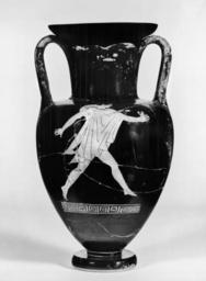 | Keywords: Hermonax - Nolan Amphora - Walters 4855 - Side B.jpg The front of this amphora depicts a youth running right He wears a chlamys and fillet and has a petasos at his neck and a scabbard at his side His hands are extended to either side and his legs are spread wide indicating that he is in full stride as he pursues the woman on the back On the reverse the woman is fleeing right and is looking around She wears a chiton serpentine bracelets and a mantle which is draped over her shoulders and down her back Her torso and right leg are shown frontally her head and left leg in profile She extends her right hand back toward her pursuer while grasping the mantle at her shoulder with the left Ribbons hold her hair in place ca 470 BC Classical terracotta cm 33 2 18 3 h x max diam ; at rim cm 14 7 diam ; at foot cm 8 5 diam accession number 48 55 34196 Don Marcello Massarenti Collection Rome no 212 Henry Walters city Baltimore Walters Art Museum Henry Walters Acquired by Henry Walters possibly with the Massarenti Collection 1902 place of origin Attica Greece Walters Art Museum license Ancient Greek red-figure pottery in the Walters Art Museum Hermonax Media contributed by the Walters Art Museum needs category review Media contributed by the Walters Art Museum needs artist update |