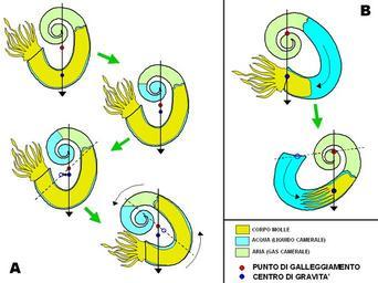 Keywords: Heteromorph ammonites buoyancy hypotheses.PNG en two hyptheses of buoyancy control by heteromorph scaphicone ammonites A Kakabadze Sharikadze 1993 the ammonites have been able to control the position of the shell shifting the fluids into the phragmocone ; B Monks Young 1997 the soft body of these ammonites did not fill all the body chamber and the animal was able to modify the centre of gravity of the shell moving within the body chamber Text in italian Own Antonov 2009-03-03 Ammonoidea morphology