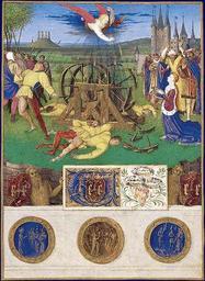 | Keywords: Heures d'Étienne Chevalier - Martyre de sainte Catherine.jpg Artwork creator Jean Fouquet A l'arrière plan le gibet de Montfaucon et l'église et la tour du Temple de Paris ca 1452-1460 illumination parchment cm 16 5 12 institution Musée Condé Bibliothèque Condé Nicole Reynaud Jean Fouquet - Les Heures d ™Ã‰tienne Chevalier Dijon Faton Ž 2006 280 p ISBN 2-87844-076-5 object history Ancien livre d'heures commandé par Étienne Chevalier trésorier du roi Charles VII Démembré et les miniatures découpées au début du XVIIIe siècle puis montées sur une planchette de bois par un menuisier encadreur parisien vers 1790 Propriété de Georg Brentano puis acquis auprès de son fils par Henri d'Orléans duc d'Aumale en 1891 Donné à l'Institut de France exhibition history Présenté dans le Santuario du musée depuis 1897 interdit de sortie du château de Chantilly en raison des conditions du don du duc d'Aumale credit line http //expositions bnf fr/fouquet/grand/f109 htm exposition bnf fr accession number Ms 71 PD-Art-100 Hours of Étienne Chevalier 06 Martyrdom of Saint Catherine of Alexandria Miniatures of Saint Catherine of Alexandria Gibet de Montfaucon Maison du Temple Paris Paris in the 15th century |
