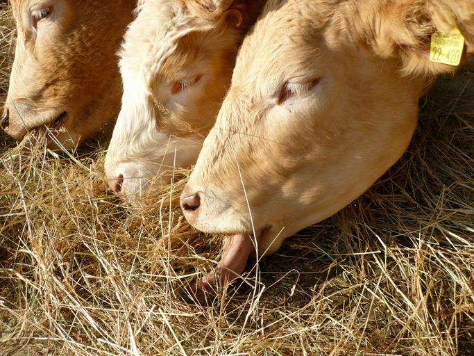 Keywords: HeuRindernahrung.jpg en German Cows eating hay Own Ramessos 2009-03 Hay Cattle in Germany Cattle with ear tags Animals in 1 row Closed eyes of animals