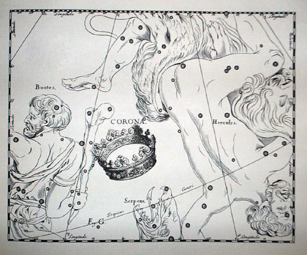 Keywords: Hev 10 fig G corona.jpg it Tavola rappresentante la costellazione della Corona Boreale nel Firmamentum Sobiescianum sive uranographia contenuto nel Prodromus Astronomiae Лист F Севе ная Ко она Атласа звёздного неба Яна Гевелия п едставляющего собой п иложение к его книге «Prodromus Astronomiæ» опубликованной в 1690 году в Гданьске Изоб ажение зе кальное обычное для небесных глобусов показывающее вид небесной сфе ы «извне» http //www atlascoelestis com/hev 2060 htm 1690 Johannes Hevelius PD-old-100 Uranographia by Johannes Hevelius Firmamentum Sobiescianum sive uranographia Corona Borealis |