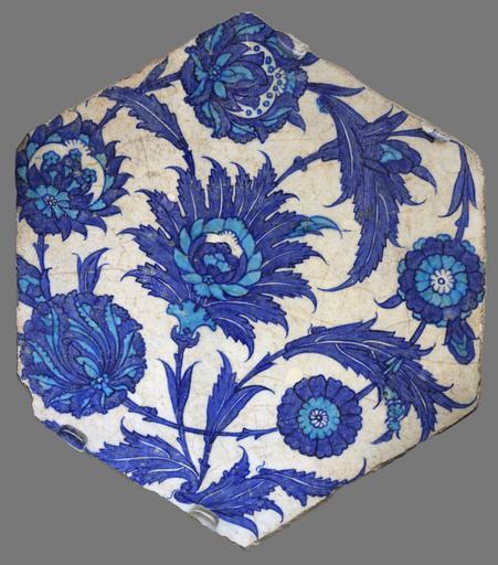 MAKE A MEME View Large Image Hexagonal Iznik tile V&A 396-1905.jpg Hexagonal blue and white tile decorated in the saz and rosette style place of creation Iznik Turkey 1525-1550 but note below implies a date of 1540-1546 Fritware/stonepaste with underglaze decoration in ...