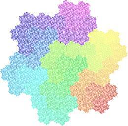 | Keywords: HexaGosperCurveColored.svg en 5th iteration of hexa Gosper curve colored by whole spectrum from red to red to see its evolution path cs 5 iterace Gosperovy křivky obarvená celým barevným spektrem od červené po červenou pro lepší pozorování jejího vývoje own NightElfik Generated with http //malsys cz/ <pre> lsystem HexagonalGosperCurve set symbols axiom L; set iterations 5; set continuousColoring true; set compressSvg false; set overoptimizeSvg true; // length 3 px width 1 px interpret R L as DrawForward 3 1 ; // 60 deg turns interpret + as TurnLeft 60 ; interpret - as TurnLeft -60 ; rewrite L to L + R + + R - L - - L L - R +; rewrite R to - L + R R + + R + L - - L - R; process all with SvgRenderer; </pre> L-Systems Space filling curves Files by User NightElfik Order 5 |