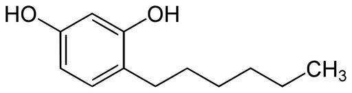 Keywords: Hexylresorcinol.svg Chemical structure of Hexylresorcinol Own work created in Inkscape 2006-08-14 Icey PD self Alkylresorcinols Hexyl compounds