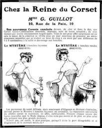 | Keywords: Hez laReine duCorsetMneGGuillotFemina1906.png Hez la Reine du Corset Mne G Guillot Femina; page XIII 1906; 15 Octobre; PD Chez la Reine du Corset MME G GUILLOT 10 Rue de la Paix 10 Ses nouveaux Corsets cambres devant de cote et dans le dos son Corset Gaine-Combinaison brevetés déposés sont de haute actualité; ils n'en restent pas moins éminemment hygiéniques Tous ils ont pour effet surprenant et en cela le talent de la créatrice se révèle sous un jour nouveau de procurer un amincissement immédiat qui se traduit au bout de cinq a six mois par une différence de 6 a 8 centimètres a la taille et davantage aux hanches Le MYSTÈRE a hanches fuyantes BREVETÉ Le MYSTÈRE a hanches rondes BREVETÉ Les personnes de santé délicate mais soucieuses d'élégance et désirant s'amincire doivent porter le Mystère a hanches fuyantes ou arrondies La réputation universelle du célèbre corset se maintient en effet inébranlable Prenant chaque saison des lignes nouvelles que la Mode impose il n'en reste pas moins et de plus en plus celui que prônent nos plus grands docteurs N'est-il pas en outre le plus pratique puisqu'il evite le port désagréable et si disgracieux de la ceinture médicale PD-old Corset advertisements 1906 advertisements in France Fashion in 1906 Femina French magazine |