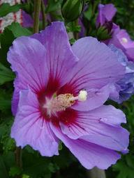 Keywords: hibiscus blossom bloom purple summer garden hedge