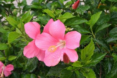 Keywords: hibiscus drop of water rain call ishigaki island outlying islands pink flowers green small okinawa japan south island fresh vivid contrast antomasako southern countries sea red stamen female