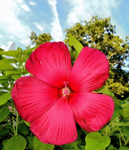 Keywords: hibiscus flower plant red flowers nature sky clouds skies leaf