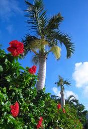 Keywords: hibiscus flowers red leaf palm trees green sky wind cloud blue blue sky atmosphere ishigaki island subtropics okinawa japan