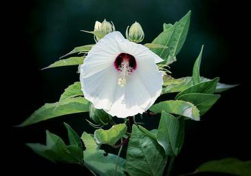 Keywords: hibiscus white blossoms tropical blooms blooming flowering plants floral decorative fleurs bright petals buds shoots growing green leaves stems branches leafy hawaiian exotic