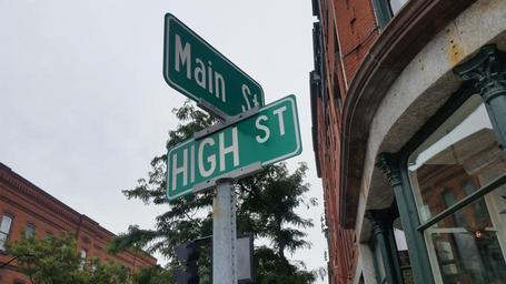 Keywords: high main street corner intersection road sign crossroad brattleboro vermont direction city town downtown marijuana weed stoned drugs