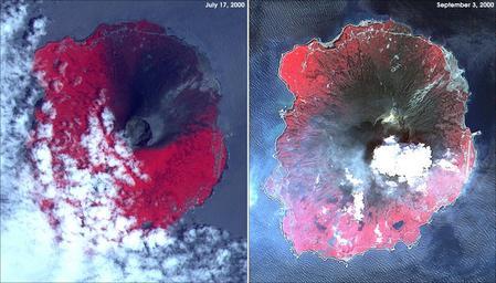 | Keywords: High Resolution View of Mount Oyama , Image of the Day DVIDS763133.jpg en Eruptions of Mount Oyama progressively covered the volcano's slopes with more and more ash over the last half of 2000 This pair of images from the Advanced Spaceborne Thermal Emission and Reflection Radiometer ASTER shows the volcano on July 17 2000 left and September 3 2000 right The false-color images combine infrared red and green light as red blue and green colors respectively Ash is dark gray vegetation appears red and water is blue-gray In the image from September 3 steam is being vented from the volcano's caldera The volcano has again been venting steam ash and large amounts of sulfur dioxide an estimated 20 to 50 kilotons per day in February 2001 /Newsroom/NewImages/images php3 img_id 4702 See this previous SeaWiFS image of Miyakajima Scientists believe most of the emitted sulfur dioxide is from degassing magma within the volcano The 8-km-wide 5-mile island is actually a low-angle stratovolcano rising some 818 meters 2 686 feet up out of the Pacific Ocean about 240 km 150 miles south of Okinawa and 320 km 200 miles east of Taiwan Many now refer to the island as Miyakejima and the volcano's summit as Mount Oyama NASA Identifier aster_oyama_ash 2011-06-25 Glenn Research Center https //www dvidshub net/image/763133 763133 2012-10-19 19 11 Mount Oyama ja 雄山 Miyake-jima JP PD-USGov Miyakejima Images from DoD uploaded by Fæ |