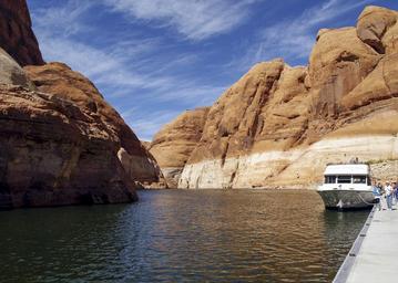 Keywords: high rock near rainbow bridge lake powell arizona usa page tourist attraction monument native sacred place landscape outdoor hot dry scenery nature desert boat landing pier water reservoir activity