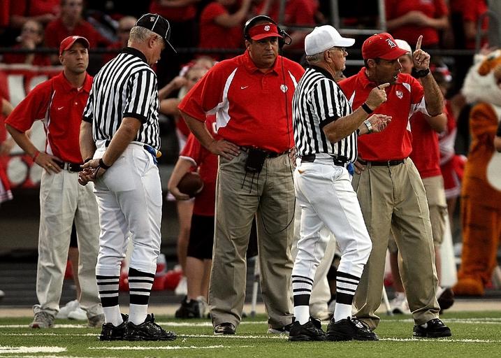 | Keywords: high school football confrontation football coach referee disagreement argument discussion sports official talking argue dispute male man conflict meeting conversation communication quarrel angry team relationship coaches football field game sport body language uncomfortable standing texas stripes striped ruling |