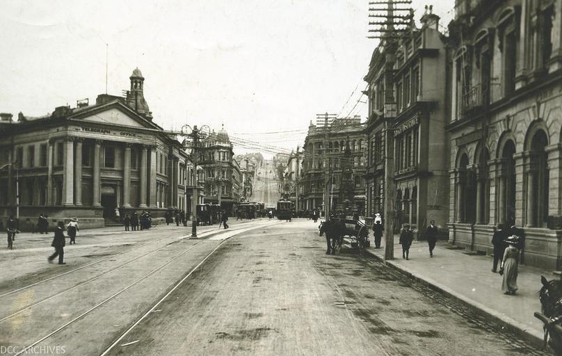 Keywords: historic trams road princesstreet dunedin cargillsmonument exchange outdoor DCC Archives, Photo 76 DCC Archives, Photo 76