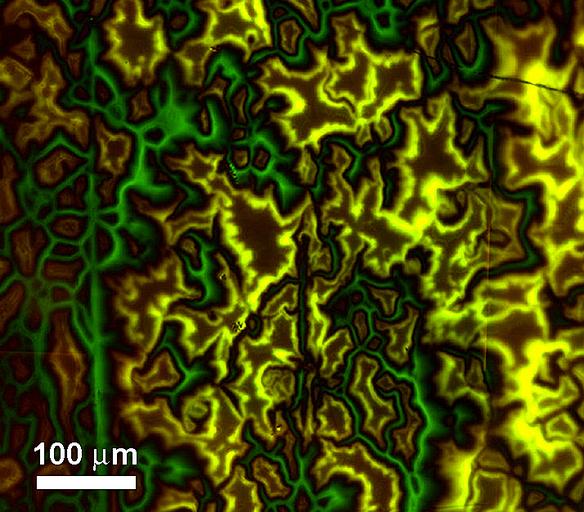 Keywords: High-Temp Superconductors (5941021554).jpg Magneto-optical image of magnetic fields within a YBCO superconductor showing electrically connected grains yellow and grain boundaries green that form barriers to superconducting currents The large reversible effect of strain observed by NIST might be due to associated changes in grain boundaries which raise the barriers to current flow and lowering the material's current-carrying capability Credit D C van der Laan/NIST and J Schwartz NHMFL-FSU Disclaimer Any mention of commercial products within NIST web pages is for information only; it does not imply recommendation or endorsement by NIST Use of NIST Information These World Wide Web pages are provided as a public service by the National Institute of Standards and Technology NIST With the exception of material marked as copyrighted information presented on these pages is considered public information and may be distributed or copied Use of appropriate byline/photo/image credits is requested https //www flickr com/photos/usnistgov/5941021554/ High-Temp Superconductors 2007-02-15 12 36 https //www flickr com/people/63059536 N06 National Institute of Standards and Technology PD-USGov National Institute of Standards and Technology https //flickr com/photos/63059536 N06/5941021554 2016-09-07 02 31 50 United States Government Work Uncategorized 2016 October 30