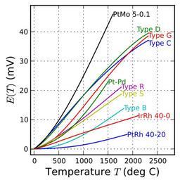 | Keywords: High temperature thermocouples reference functions.svg en Type B R S thermocouples' reference functions using NIST ITS-90 calibration curves plus type C D G thermocouples' functions from OMEGA Inc 's datasheet note these are IPTS68 calibrations Python source code can be found on File Low_temperature_thermocouples_reference_functions svg 2013-12-07 19 48 53 own Nanite cc-zero Uploaded with UploadWizard Thermocouple diagrams | ||||