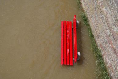 Keywords: high water flooding park bench red bank in the water flooded flood water water level peak river riverside disaster flood disaster storm force of nature civil protection flood of the century climate change