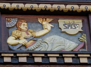 Keywords: hildesheim germany lower saxony historically old town facade truss fachwerkhaus relief image hope dove sword suicide