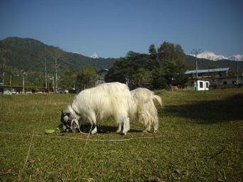 | Keywords: Himalayan Goats.JPG en These pair of Himalayan goats were spared slaughter for Dashain festival at Pokhara in Nepal They were purchased by the Tashaling Tibetan settlement monastry and are lucky to spend the rest of their lives grazing in this beautiful settlement lawns in Pokhara The famous PASHMINA wool is extracted from this breed of mountain goats own Rudolph A furtado Friday 25-11-2011 Changthangi Cc-zero | ||||